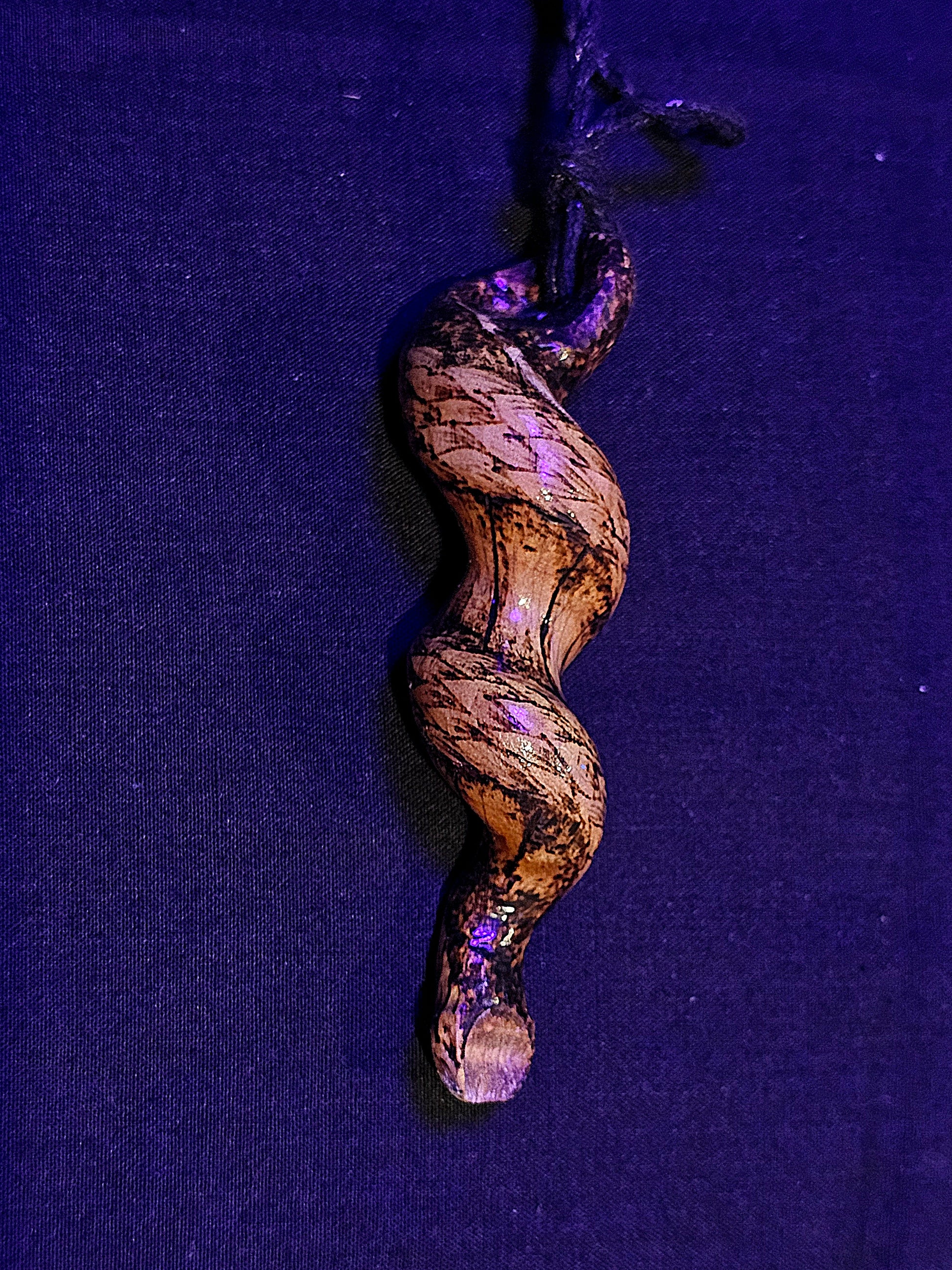 Silkrattle is a spoon of smooth, serpentine elegance, its handle wrapped in shimmering scale-like etchings. When stirring, it emits a soft rattling lullaby that calms beasts and bewilders minds. Rumored to charm those who listen for too long.